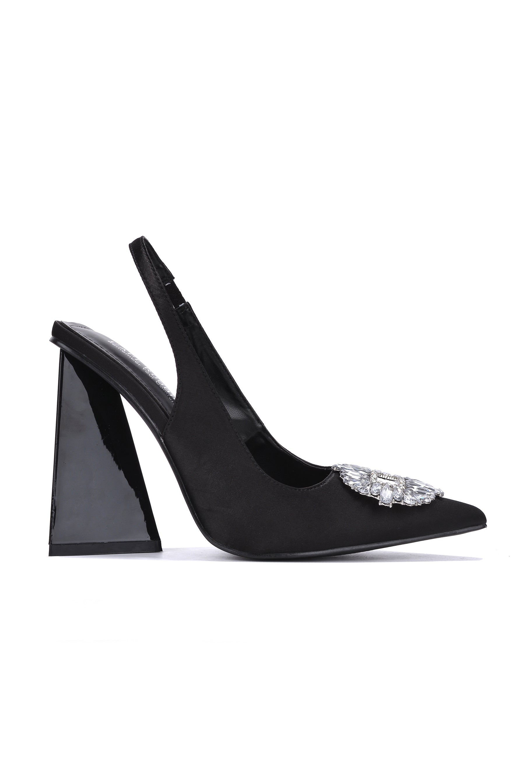 Cape Robbin's Edona heels bring versatility to any shoe collection. The delicate silky finish and gem embellishment on the vamp serve glitz and glamour. Plus,the odd-shaped block heel adds a unique sturdy look.